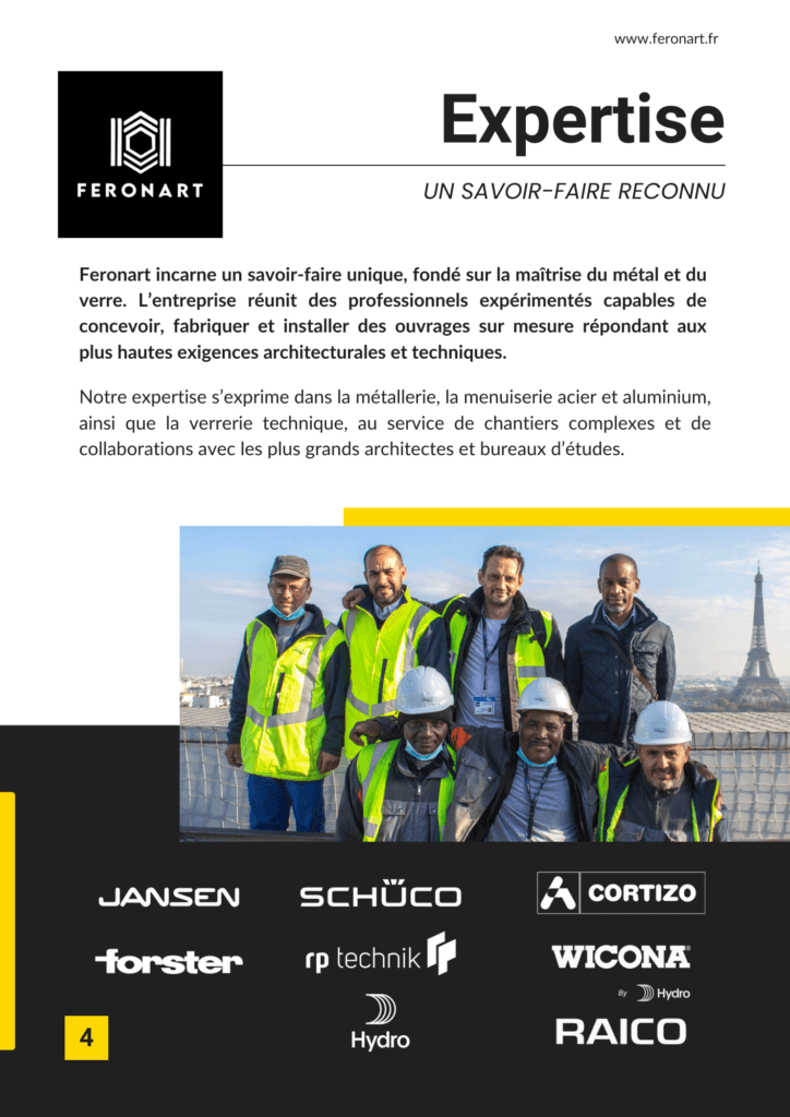La création de la brochure Feronart a permis de structurer le discours de l’entreprise : présentation de la mission, mise en avant des expertises, valorisation des références et des partenaires techniques, et clarification de l’accompagnement proposé de A à Z. Pensée comme un véritable outil commercial, elle accompagne aujourd’hui Feronart lors de ses rendez-vous clients et appels d’offres.