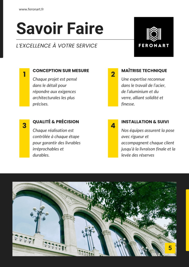 L’un des enjeux majeurs du projet Feronart était de traduire un savoir-faire très technique en une image claire, premium et immédiatement compréhensible. L’entreprise intervient sur des projets complexes, souvent soumis à de fortes contraintes réglementaires et architecturales : il était donc essentiel que ses supports de communication reflètent ce niveau d’exigence.